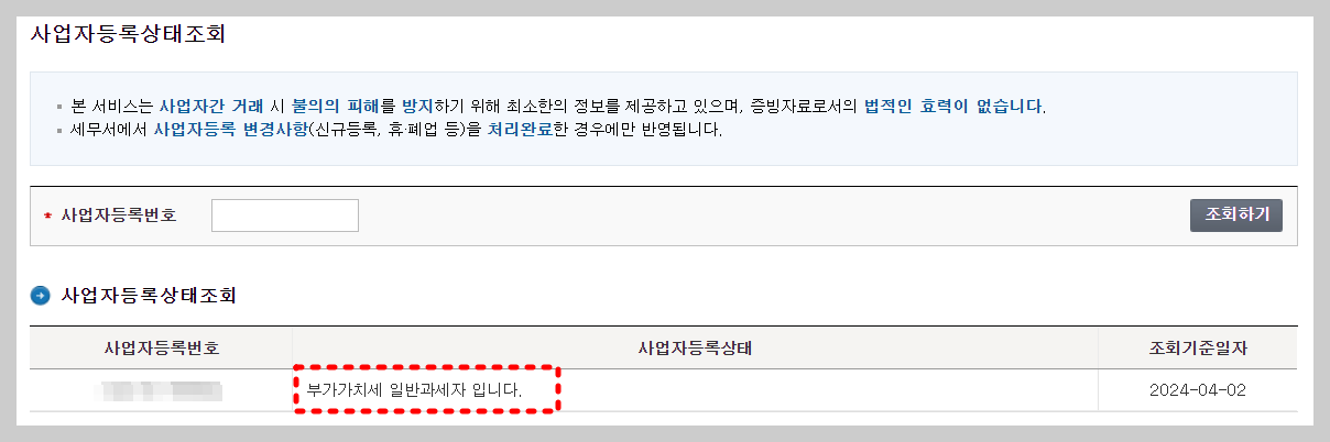 국세청 홈택스에서 사업자등록번호를 통해 상태를 조회하면, 사업자의 과세 유형과 사업자 상태를 확인 가능합니다.
